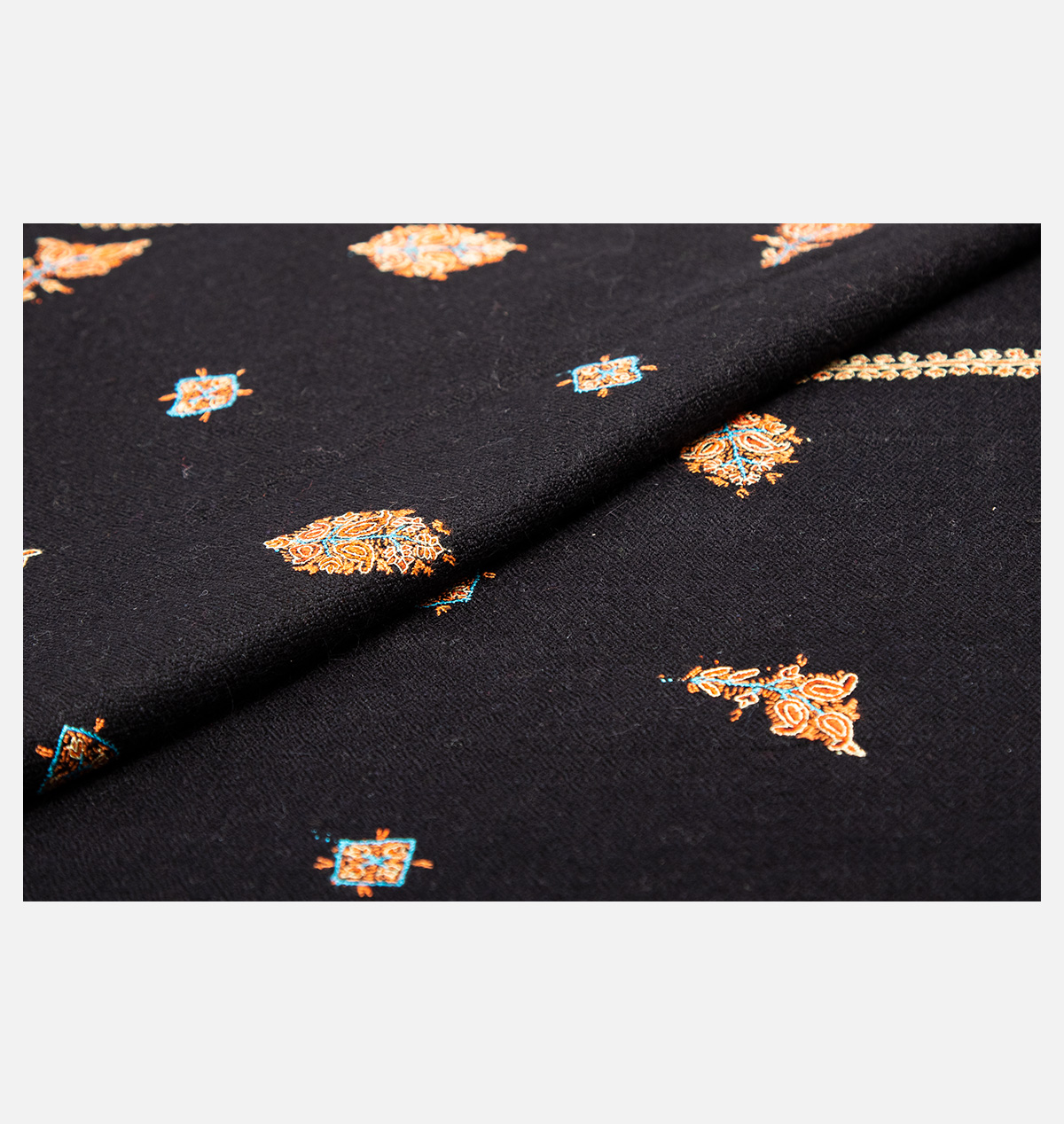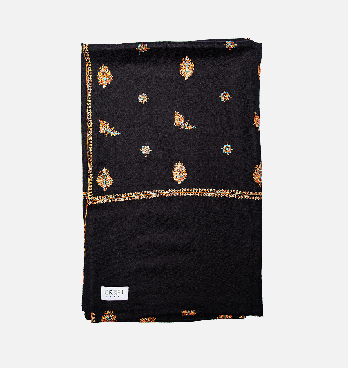 This elegant hand wooven designer pashmina shawl has been painstalikgly embroided with centurioes old intricate sozni design all over it, making one love to witness a tangible cascade of fineness, refinemnet and royalty.