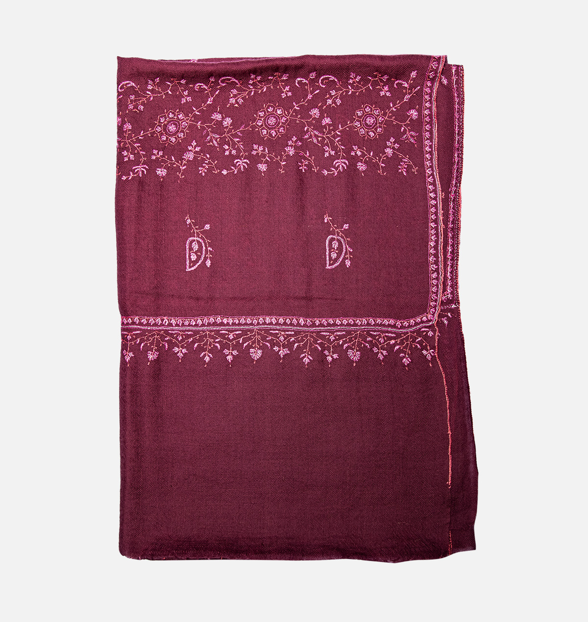 This elegant hand wooven designer pashmina shawl has been painstalikgly embroided with centurioes old intricate sozni design all over it, making one love to witness a tangible cascade of fineness, refinemnet and royalty.