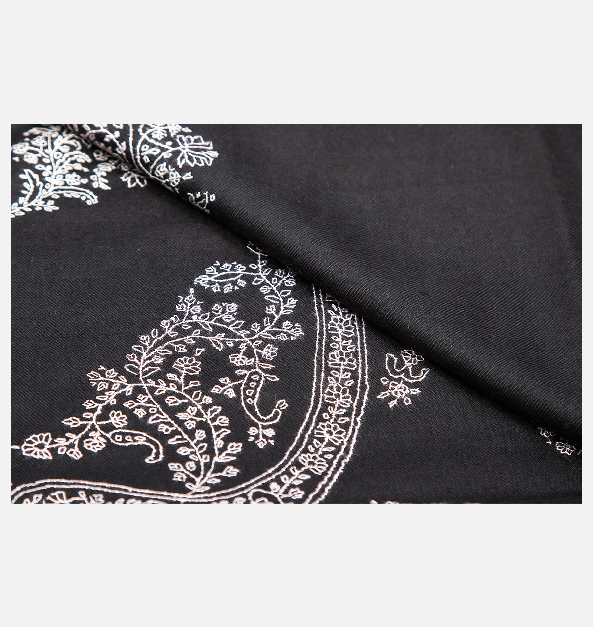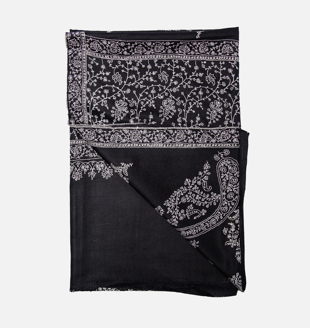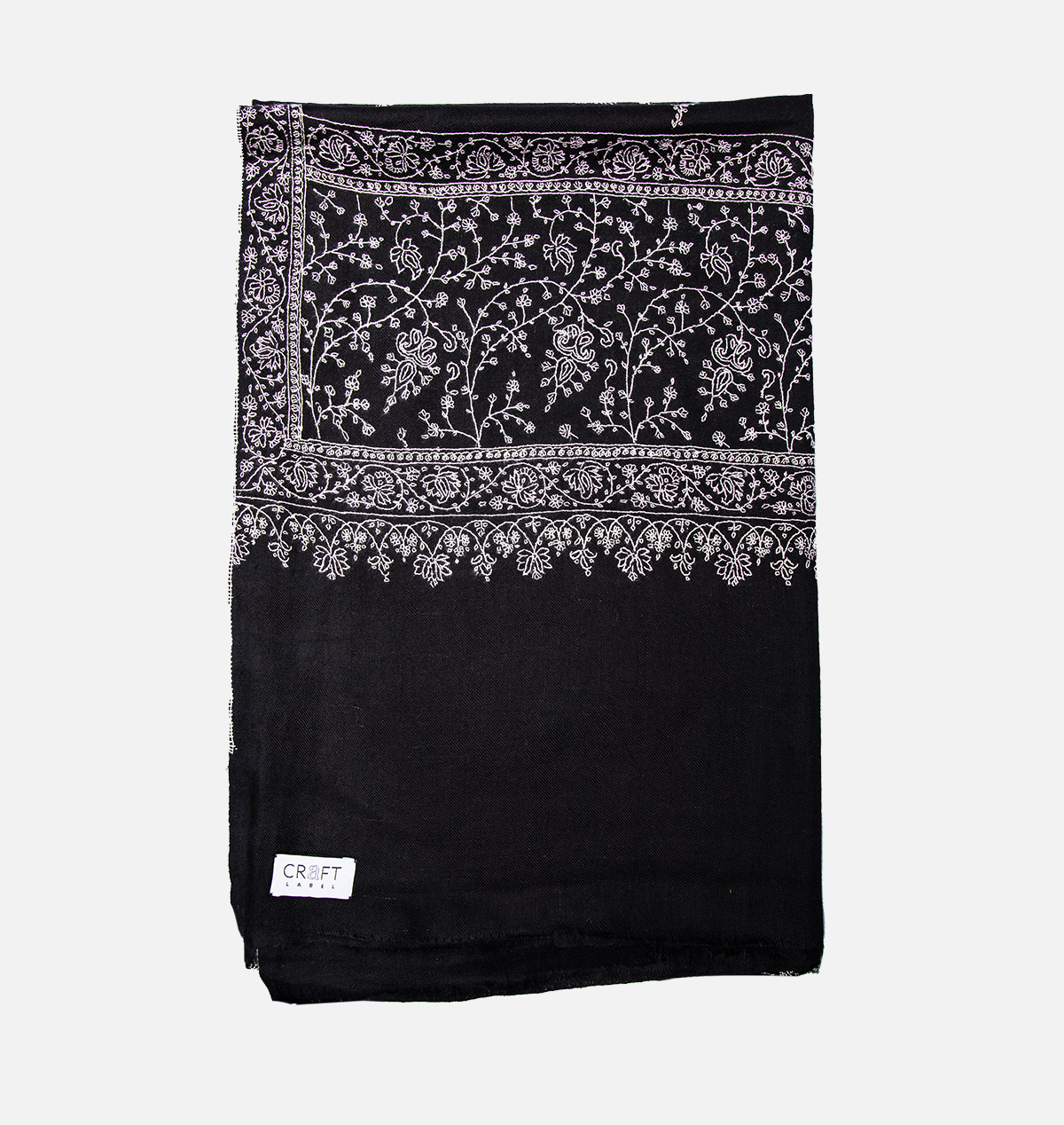 This elegant hand wooven designer pashmina shawl has been painstalikgly embroided with centurioes old intricate sozni design all over it, making one love to witness a tangible cascade of fineness, refinemnet and royalty.
