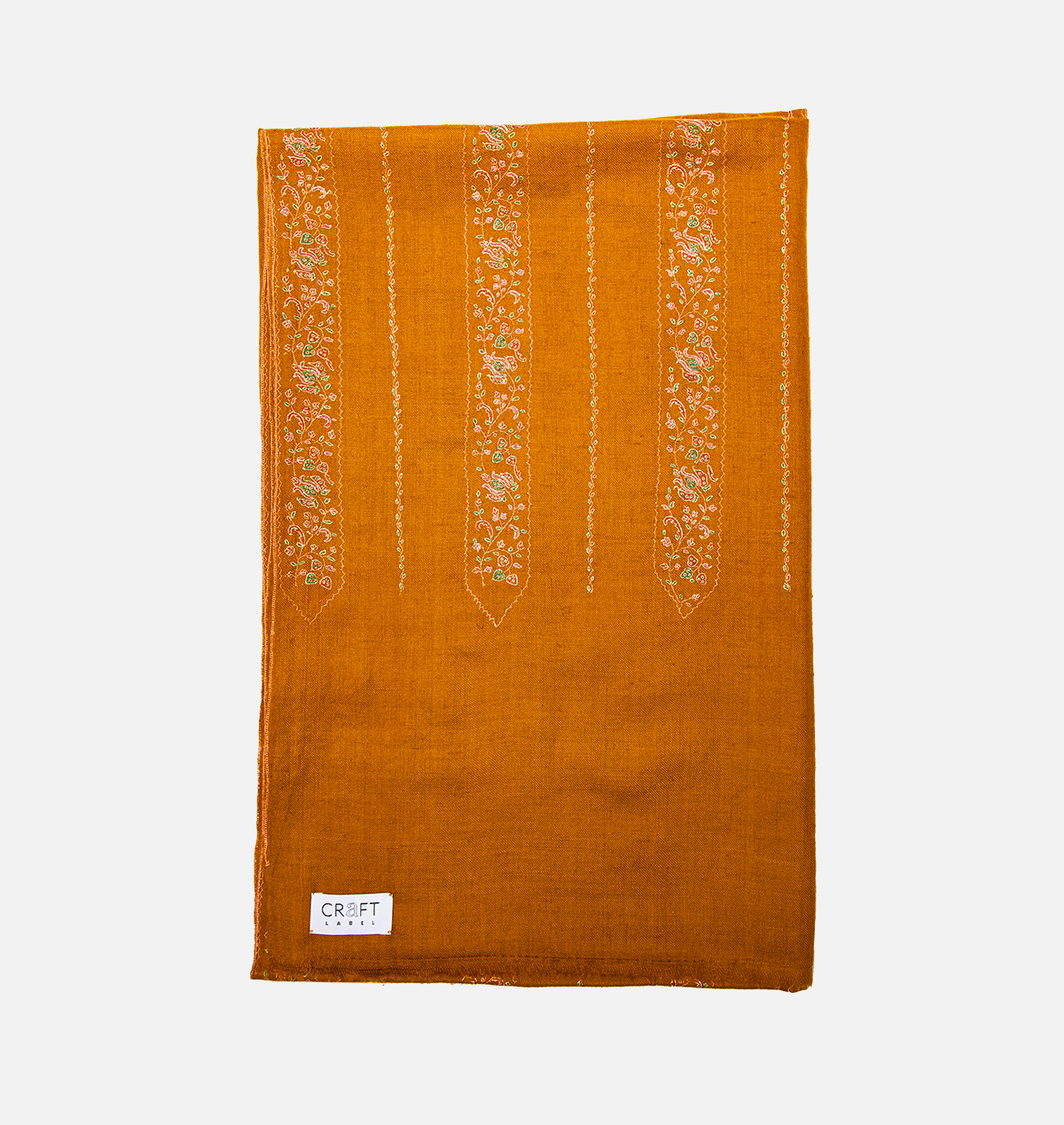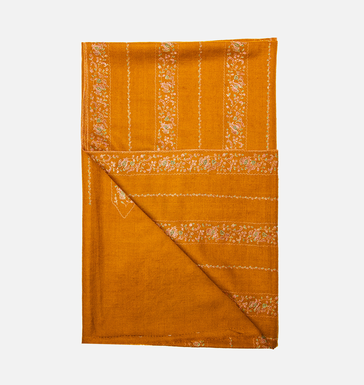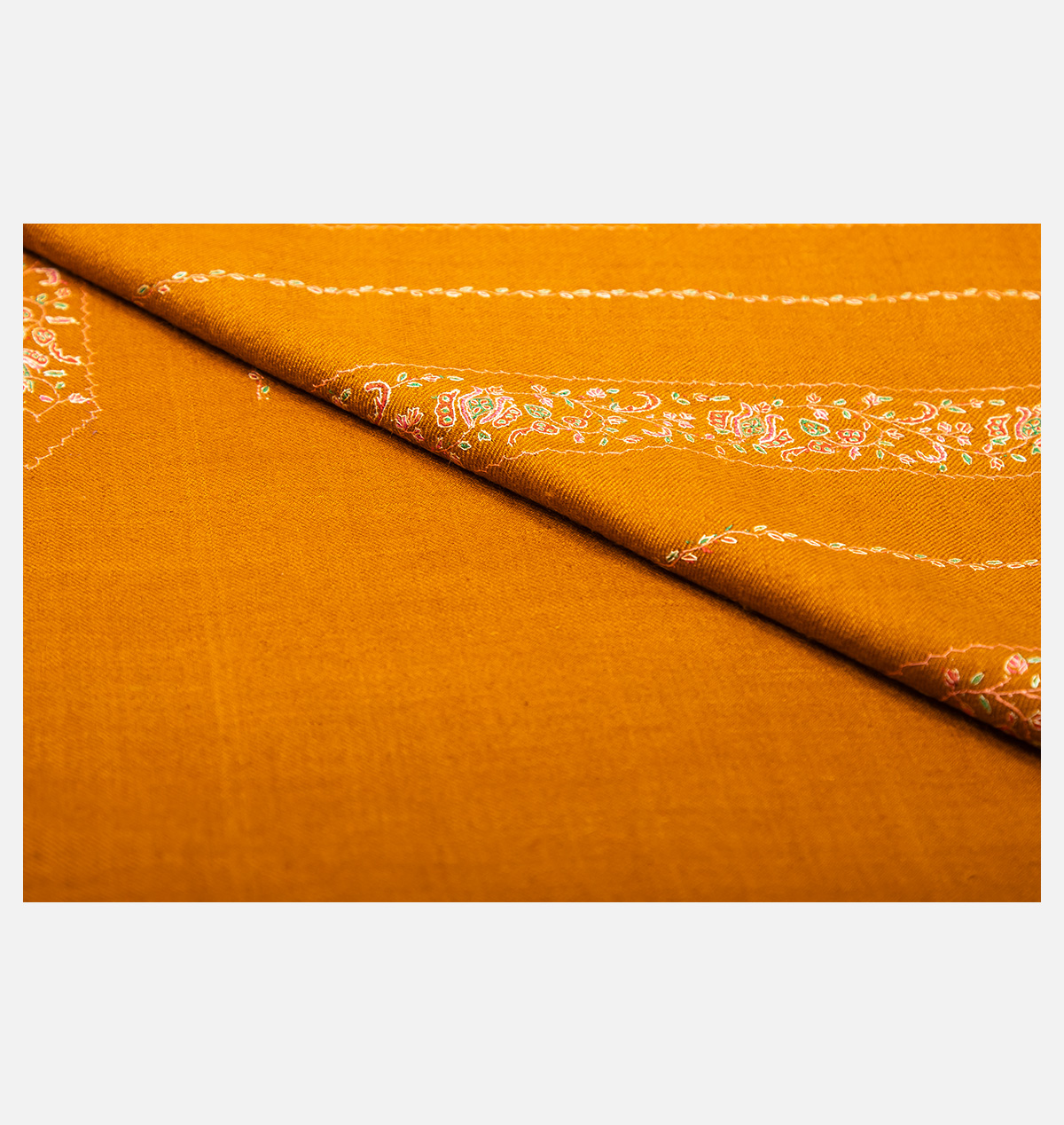 This elegant hand wooven designer pashmina shawl has been painstalikgly embroided with centurioes old intricate sozni design all over it, making one love to witness a tangible cascade of fineness, refinemnet and royalty.